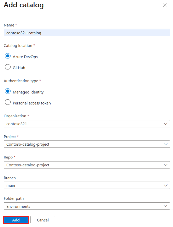 You can add a catalog from an Azure Repos repository or a GitHub repository. You can choose to authenticate by assigning permissions to an MSI or by using a PAT, which you store in a key vault.