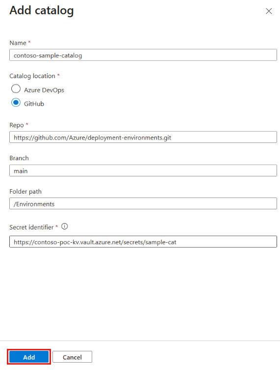 This article explains how to add and configure a catalog for your Azure Deployment Environments dev center or project.