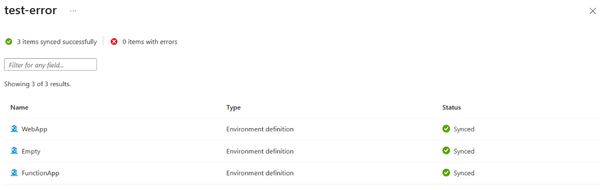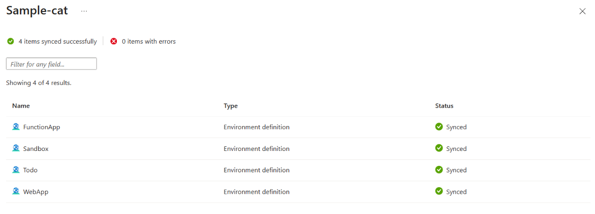 In the Azure portal, you can get more information about the catalog sync status and any warnings or errors by selecting the status link. The status link opens a pane that shows the sync status, the number of environment definitions that were added, and the number of environment definitions that were ignored or failed.