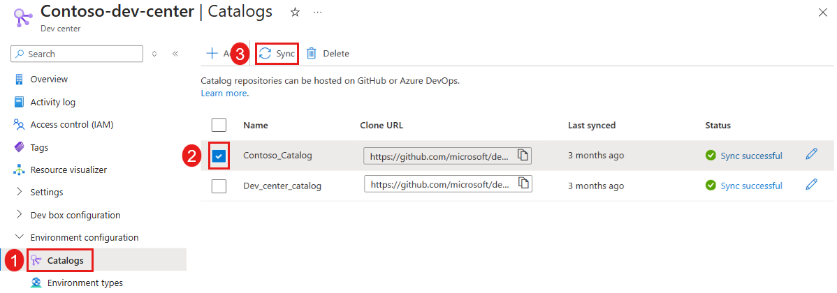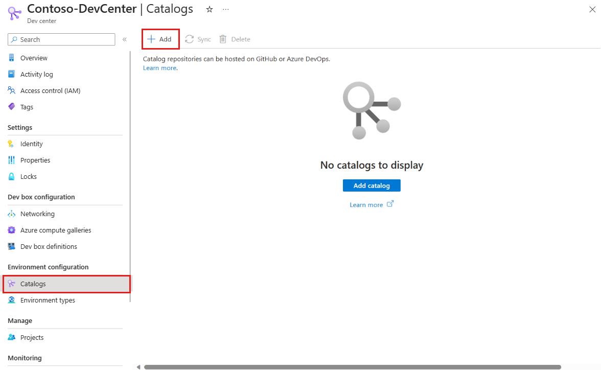 On the left menu for your dev center or project, under Environment configuration, select Catalogs.