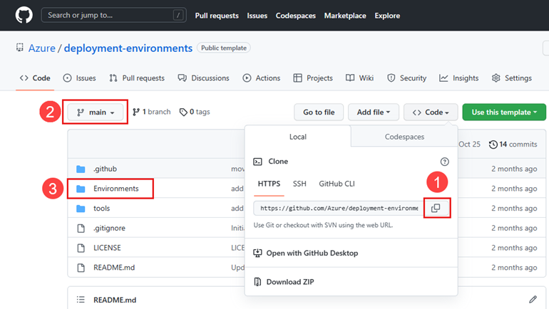 To add a catalog, you must specify the GitHub repo URL, the branch, and the folder that contains your environment definitions. You can gather this information before you begin the process of adding the catalog to the dev center.