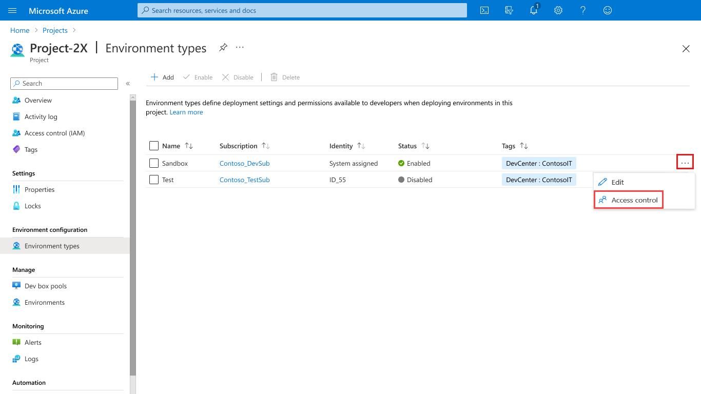 Select the ellipsis (...) next to the environment type, and choose Access control.