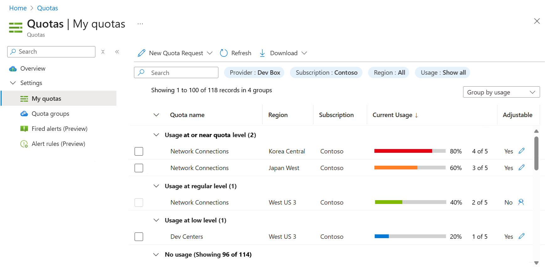 To help you understand where and how you're using your quota, the Quota Management System (QMS) provides a detailed report of resource usage across resource types in each of your subscriptions on the My Quotas page. QMS provides several advantages to the Dev Box service including:
