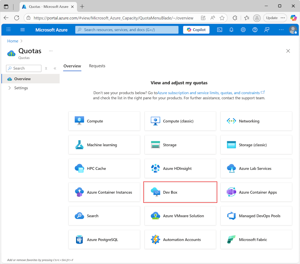 This article describes how to determine your quota limits and usage. You can follow the instructions to submit a support request to increase the number of resources for Microsoft Dev Box in your Azure subscription.