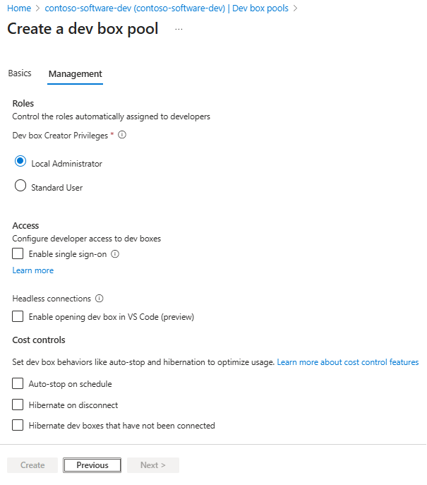 Setting Value Roles Dev box Creator Privileges Select Local Administrator or Standard User. Access Enable single sign-on (SSO) Select to enable users to sign in to their dev boxes by using their organizational credentials. Headless connections Select to enable developers to open a dev box in Visual Studio Code without a full desktop experience. Cost controls Auto-stop on schedule Select the checkbox to enable an autostop schedule. You can also configure an autostop schedule after the pool is created. Stop time Select a time to shut down all the dev boxes in the pool. Dev boxes that support hibernation will hibernate at the specified time. Dev Boxes that don't support hibernation shut down. Time zone Select the time zone for the stop time. Hibernate on disconnect Hibernates dev boxes that no one is connected to after a specified grace period. Grace period Hibernates dev boxes that have never been connected to after a specified grace period. Select Create.