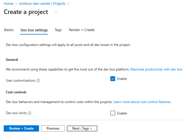 Setting Value Deployment environment definitions Select to enable Dev Box to sync deployment environments definitions from a catalog attached to the project. Image definitions Select to enable Dev Box to sync image definitions from a catalog attached to the project. (Optional) On the Tags tab, enter a name/value pair to assign.