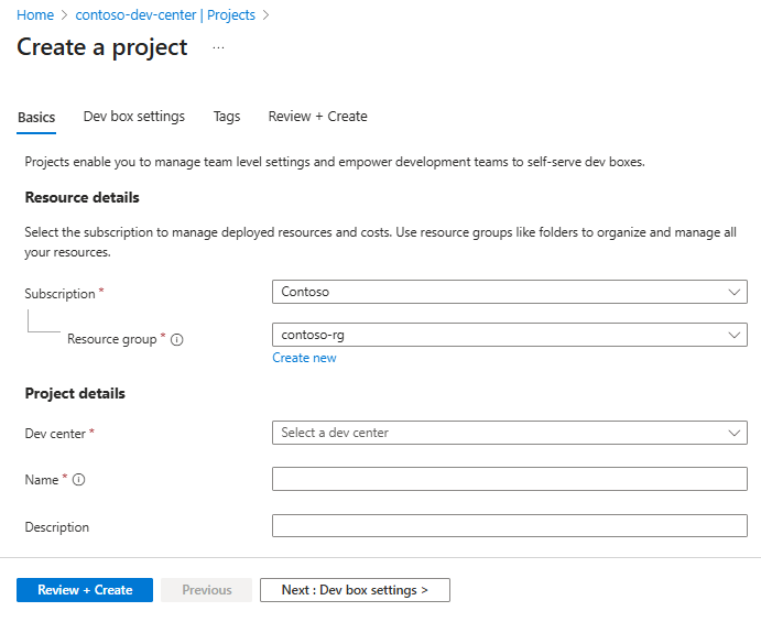 Setting Value Subscription Select the subscription in which you want to create the project. Resource group Select an existing resource group, or select Create new, then enter a name for the new resource group. Dev center Select the dev center to associate with this project. All settings at the dev center level apply to the project. Name Enter a name for the project. Description Enter a short description of the project. On the Dev box settings tab, enter the following values: