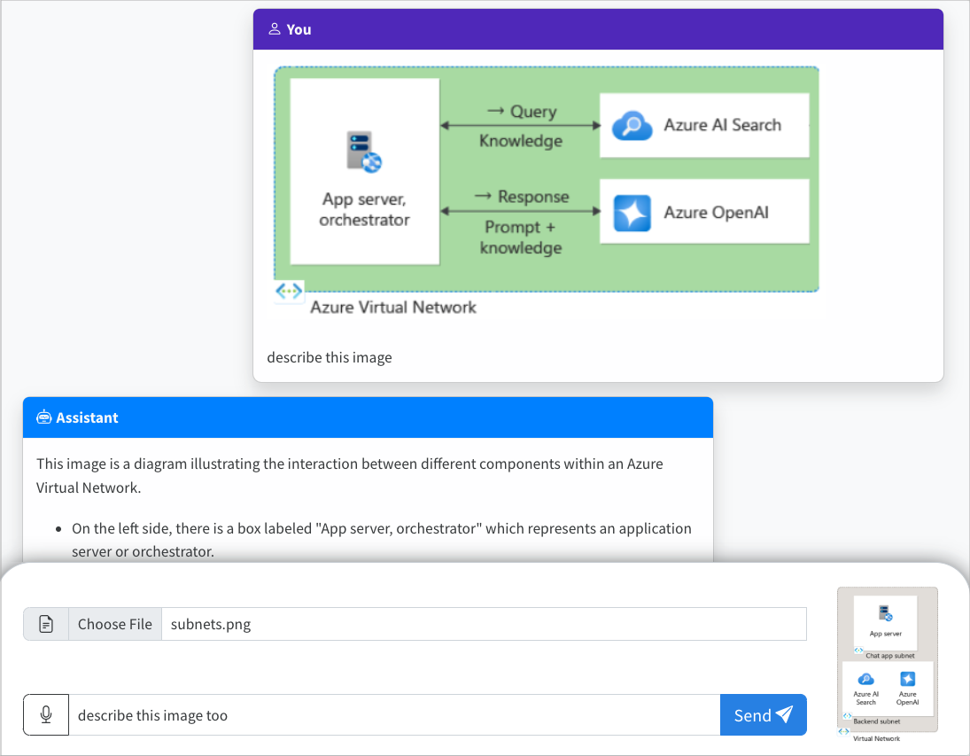 src/quartapp/static/speech-input.jsandspeech-output.js.Image Preview: Displays the uploaded image in the chat before analysis submission for confirmation. The preview updates automatically when a file is selected.