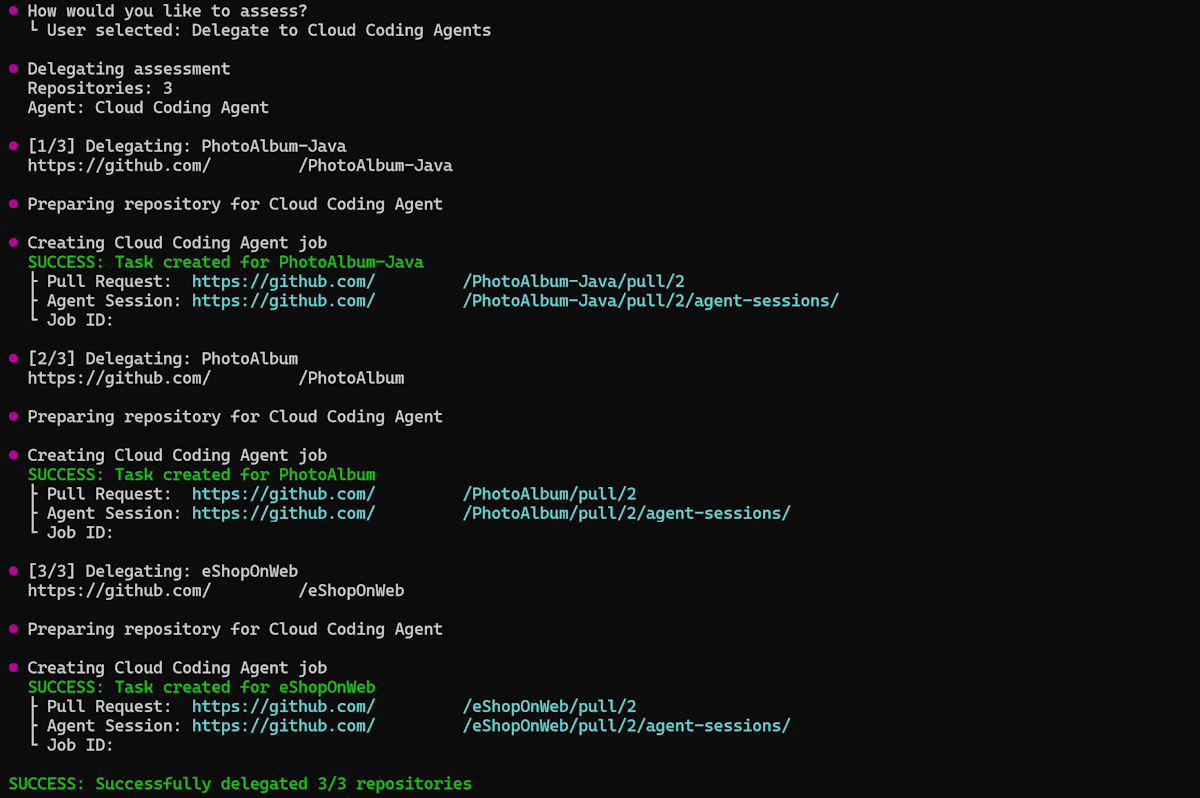 By using Cloud Coding Agent delegation, you enable parallel execution across all repositories. This approach significantly reduces the total assessment time for large portfolios.