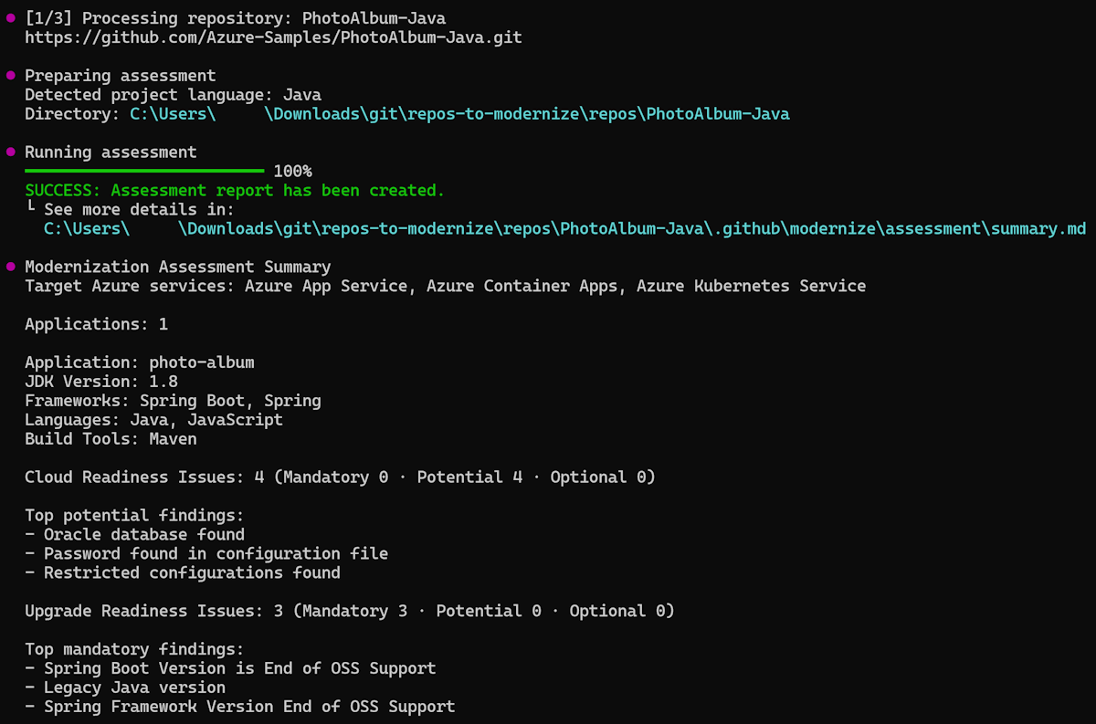 Batch assessment enables you to analyze multiple applications simultaneously, providing a comprehensive view of the modernization landscape across your applications. This article guides you through the process of assessing multiple repositories efficiently.