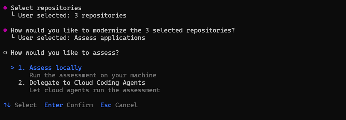 To run assessment, choose to either assess locally or delegate to cloud coding agents. Select 1. Assess locally.