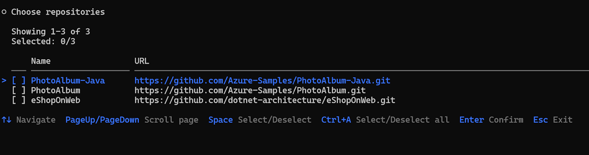 repos.jsonfile and displays the repository list:Select repositories to assess, and press
