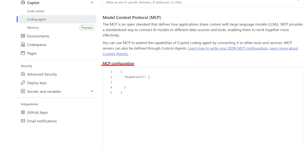 Configure GitHub Copilot Modernization MCP Server in Cloud Coding Agent section of your repository settings as shown in the following example: