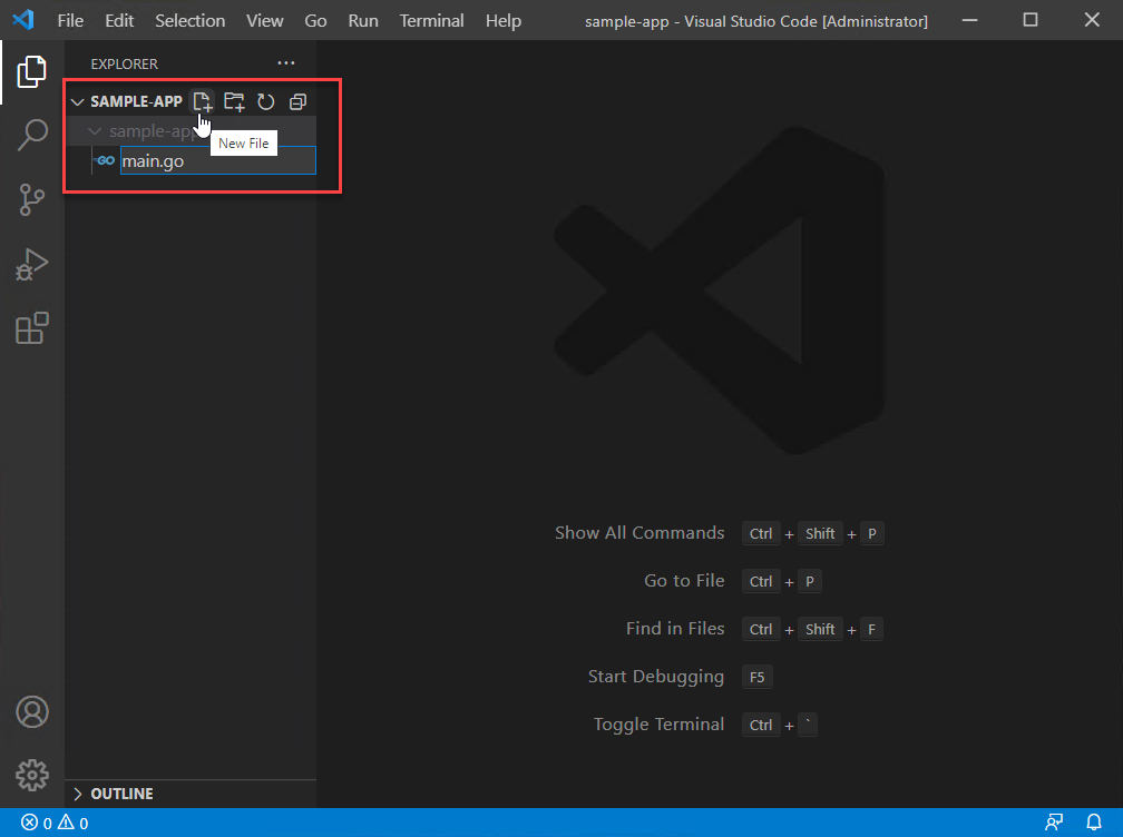 Select New Folder in the Explorer panel, then Create the root director for your sample Go application named sample-app A screenshot showing how to create a folder in Visual Studio Code.