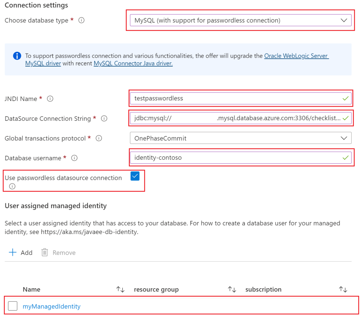 Configure a passwordless database connection for Oracle WebLogic Server on Azure VMs