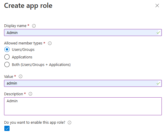 When you reach the Declare roles for an application section, use the App roles UI to create roles for the administrator and the regular user.