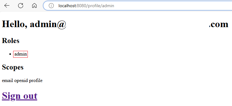 Both the /profile/admin and /profile/user endpoints return the profile page. The profile page UI is defined in profile.qute.html, as shown in the following example. This page displays the user's name, roles, and scopes. The profile page also has a sign-out link at /logout, which redirects the user to OIDC provider to sign out. The profile page is written using the Qute templating engine. Note the use of {} expressions in the page. These expressions make use of the values passed to the TemplateInstance using the data() method. For more information on Qute, see Qute templating engine.