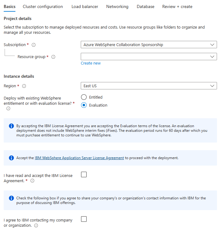 - An IBMid with necessary entitlement for WebSphere Traditional (optional). If you create the deployment with an evaluation license, you don't need to provide an IBMid with entitlement for WebSphere Traditional. To get the benefit, you need to accept the IBM WebSphere Application Server License Agreement during the deployment creation steps. Otherwise, you must enter your registered IBMid and your IBMid must have active WebSphere entitlements associated with it. If provisioning with IBMid fails due to lack of entitlements, ask the primary or secondary contacts for your IBM Passport Advantage site to grant you access. Alternately, follow steps at IBM eCustomer Care for further assistance. This offer assumes you're properly licensed to run offers in Microsoft Azure. For more information, see IBM eCustomer Care.