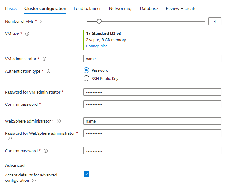 - Provide a password for Password for WebSphere administrator. Use the same value for Confirm password.