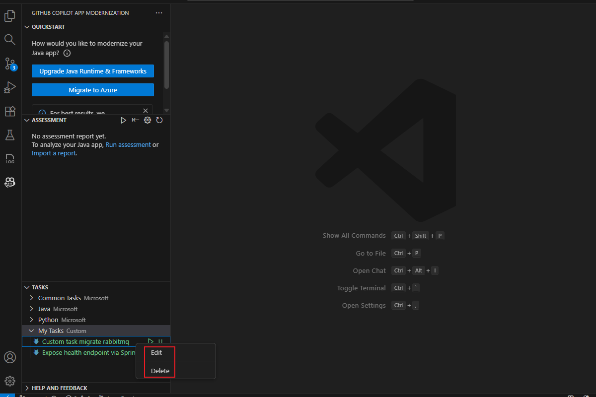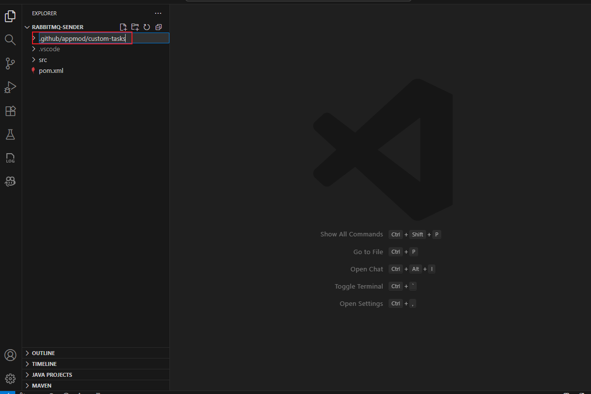 rabbitmq-senderproject folder from the cloned repository. Then, switch to the source branch.In the Activity sidebar, open the GitHub Copilot app modernization extension pane, hover over the TASKS section, and then select Create a Custom Task.