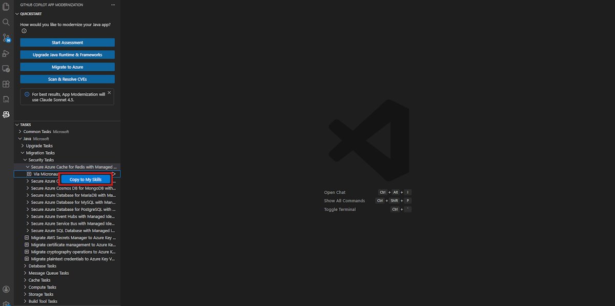 If you previously used custom tasks - stored in .github/appmod/custom-tasks/ of the project or Visual Studio Code user data - the extension automatically migrates them to the new .github/skills/ location of the project on first load.