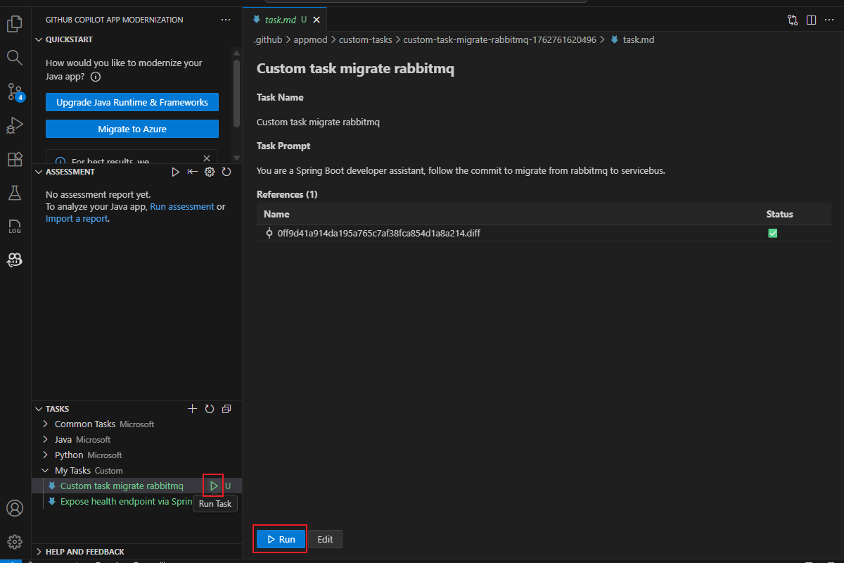 Select Run at the bottom of the file. Or find your own task in the TASKS - My Tasks section of GitHub Copilot app modernization pane and run the task by selecting Run Task.