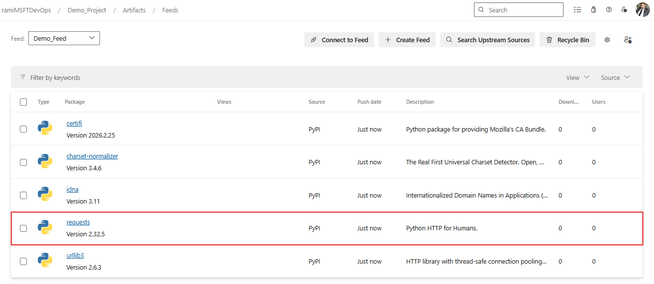 pip install requestsOnce the installation completes, Azure Artifacts saves a copy of the package to your feed. Navigate to your feed to verify that the package is available, as shown in the following screenshot.