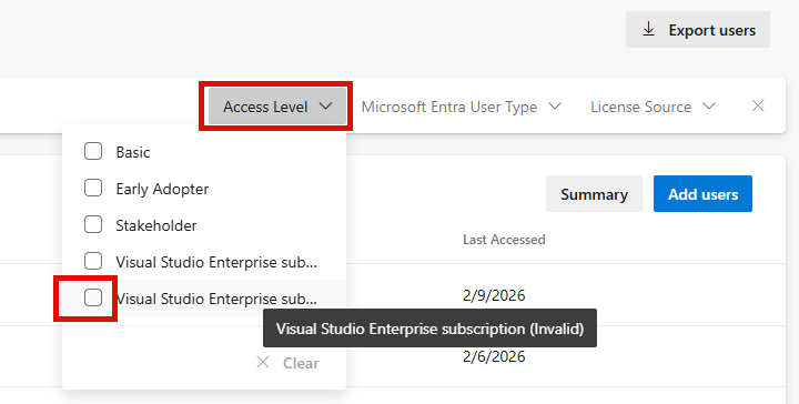 2. Select the Access level filter and choose an invalid subscription type, such as Visual Studio Enterprise subscription (Invalid).