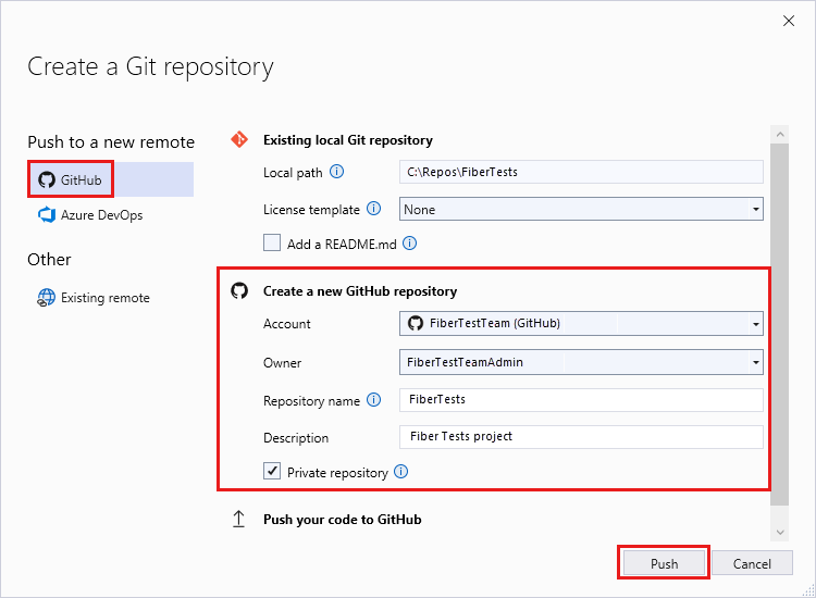 In the Create a Git repository window, choose GitHub, select your GitHub account, owner name, and a new repo name, and then choose Push.