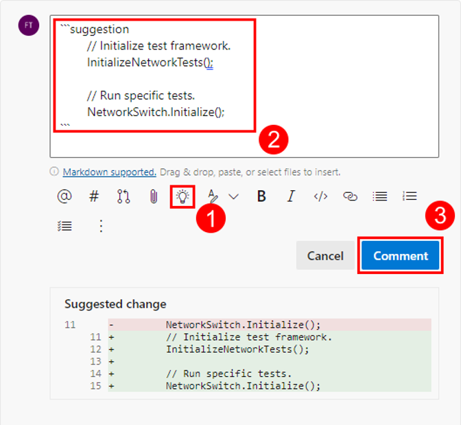 2. Select the light bulb icon under the comment box to make your suggested changes in the comment box within a fenced code block, and then choose Comment. You won't see a light bulb icon if you add a comment to the original code (left-hand side) of a side-by-side diff view.
