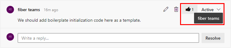 PR authors and reviewers can like their own or someone else's comment by hovering over the comment and choosing the thumbs-up icon: