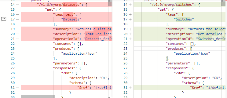 Screenshot of a side-by-side diff view in the Files tab of a P R.