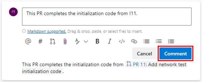 • Address the author or other reviewers directly in your comments by using @username, and reference work items by using #workitemID. You can also reference other PRs by using !pullrequestID.
