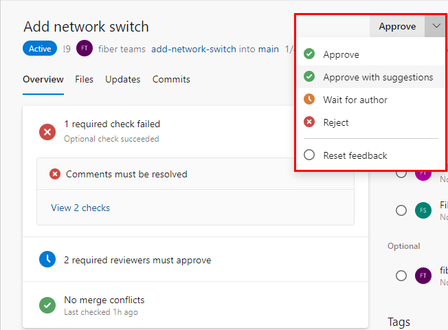 • Reject: indicates that the changes aren't acceptable. When you choose this option, add a comment explaining why. If a required reviewer sets this vote option, the vote will block PR approval.