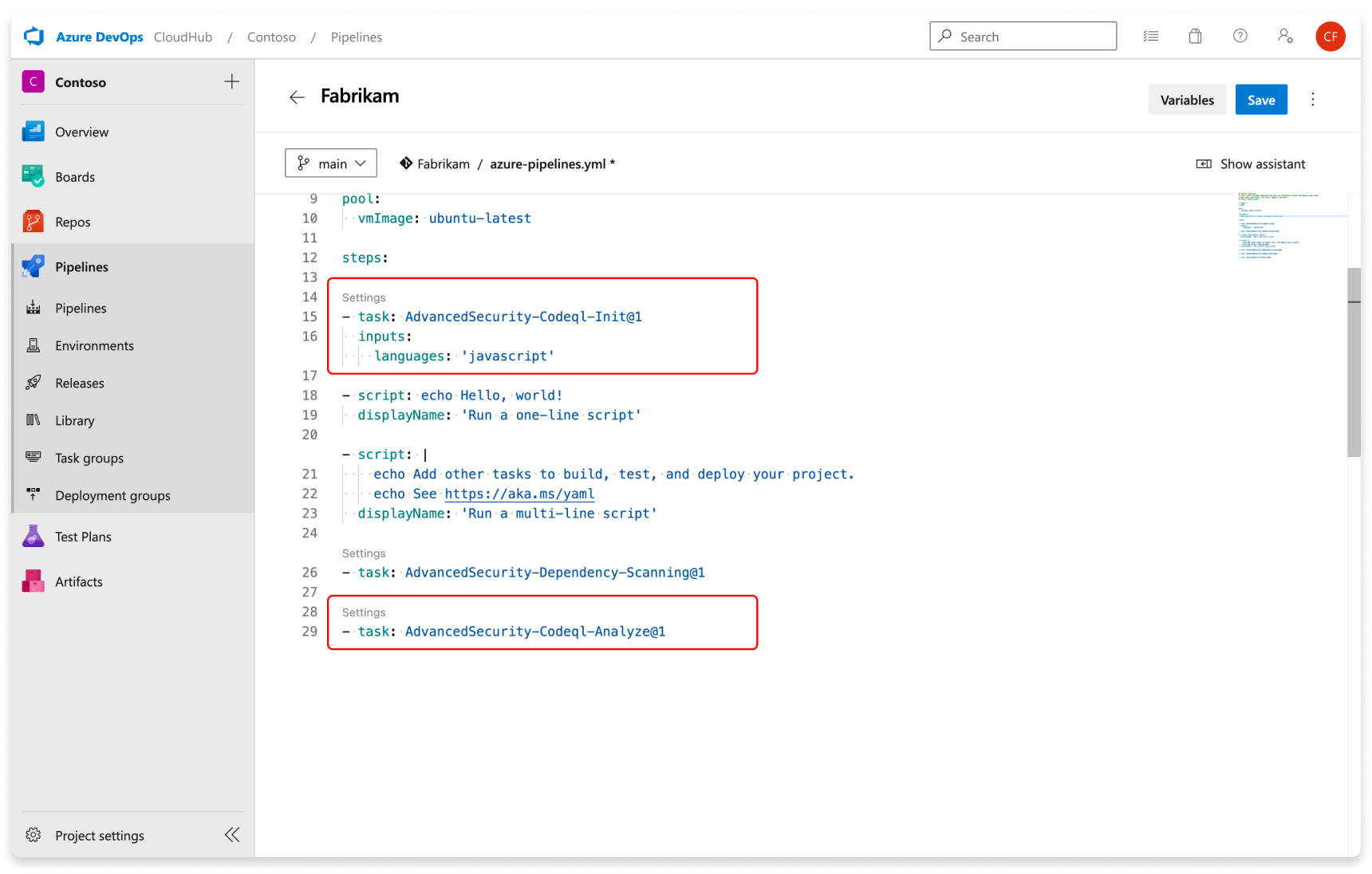 Screenshot of code scanning pipeline setup for YAML.