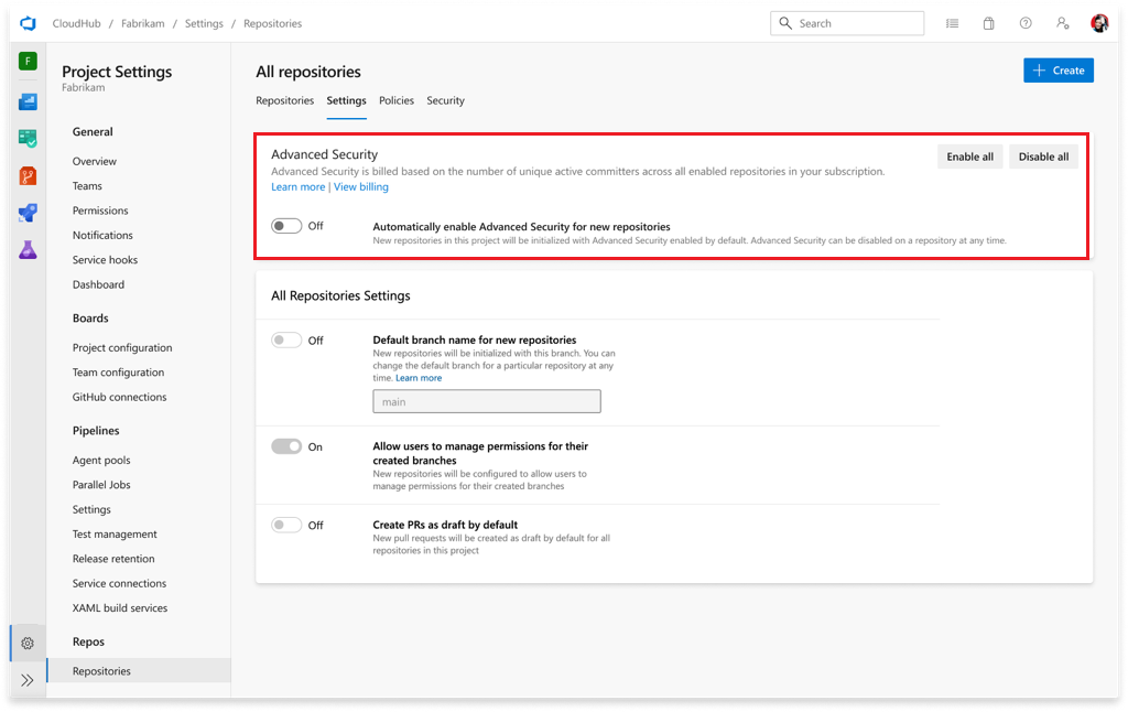 6. Optionally, select Automatically enable Advanced Security for new repositories so that any newly created repositories have Advanced Security enabled upon creation.