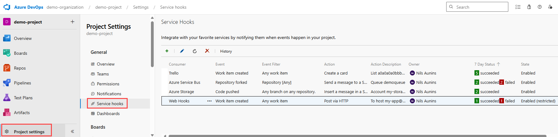 To view the activity and status of your subscriptions, go to the Service Hooks page.