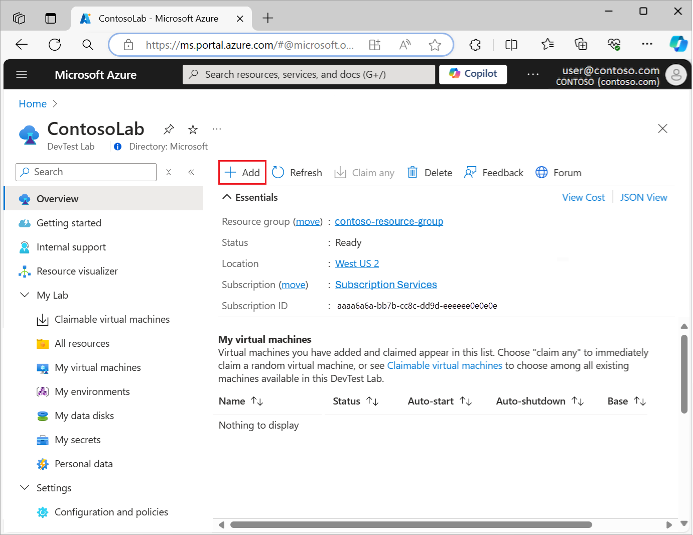 On the lab Overview page, expand the My lab section on the left menu, and select Claimable virtual machines.
