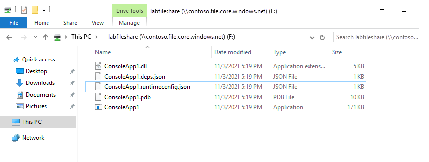 When the publish operation finishes, the application files are available on the Azure file share. You can now mount the file share from another computer, server, or lab VM, to access the application.