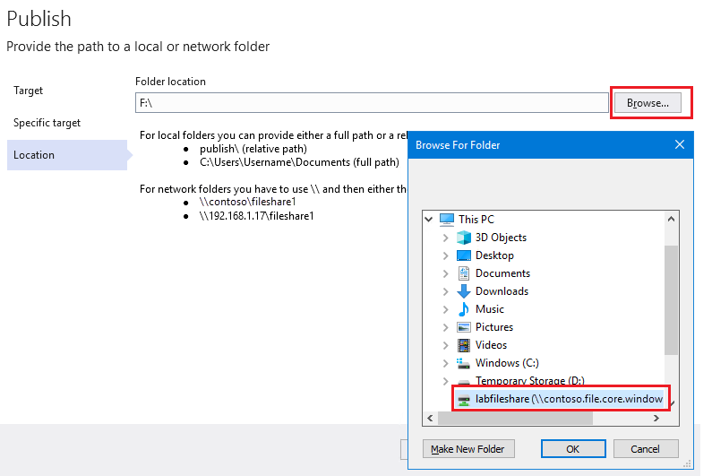 For the Location option, select Browse, and then select the file share you mounted earlier.