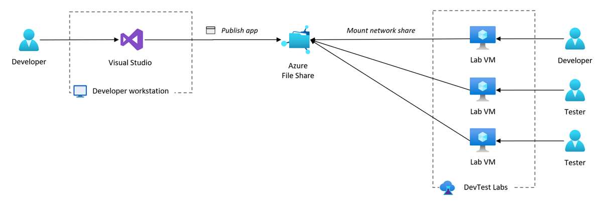This article uses an app from Visual Studio as an example. Visual Studio enables you to deploy an application, service, or component to other computers, devices, servers, or in the cloud. To deploy an application to a lab VM in Azure DevTest Labs, you first publish the application files to an Azure file share. You then access the application on the file share from within the lab VM.