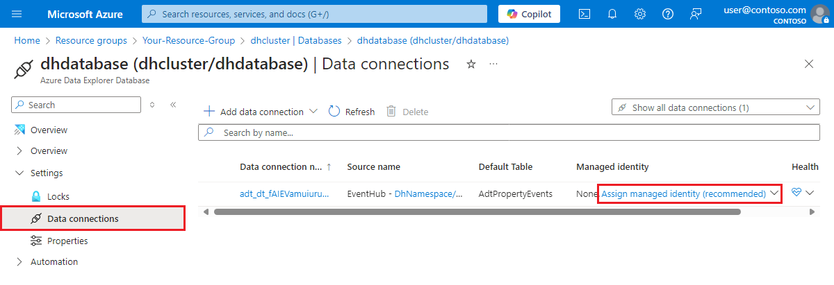 - Update the data connection for the Azure Data Explorer database to use a system-assigned managed identity. In the Azure portal, you can update the data connection by navigating to the Azure Data Explorer cluster and using Databases in the menu to navigate to the data history database. In the database menu, select Data connections. In the table entry for your data history connection, you should see the option to Assign managed identity, where you can choose System-assigned.