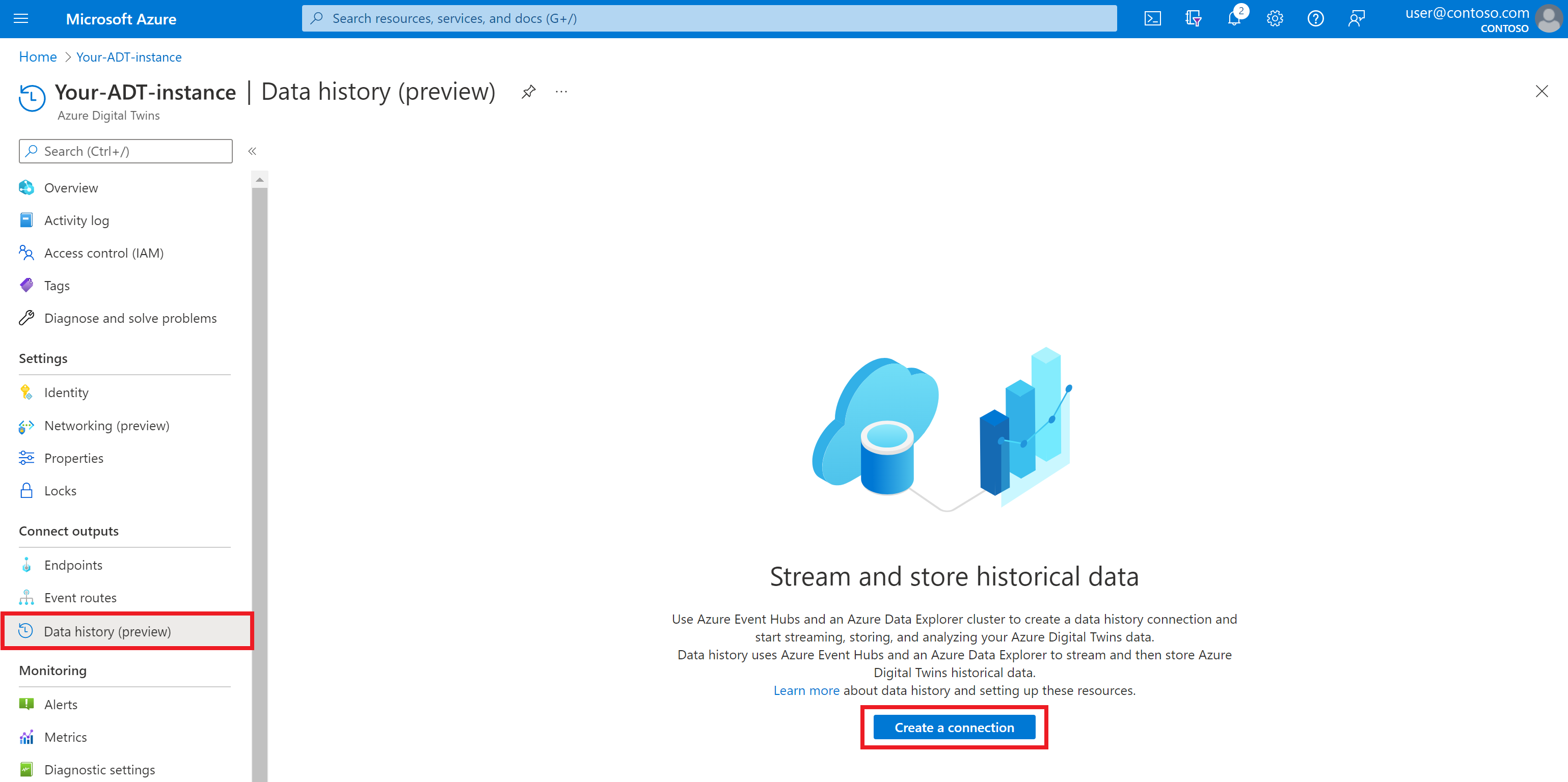This article shows how to set up a working data history connection between Azure Digital Twins and Azure Data Explorer. It uses the Azure CLI and the Azure portal to set up and connect the required data history resources, including: