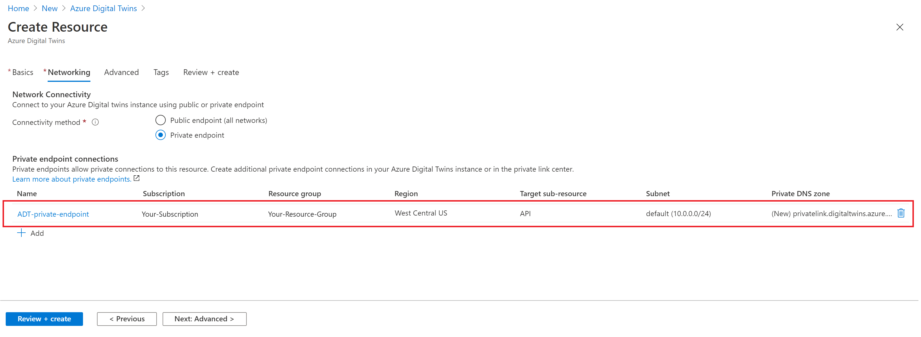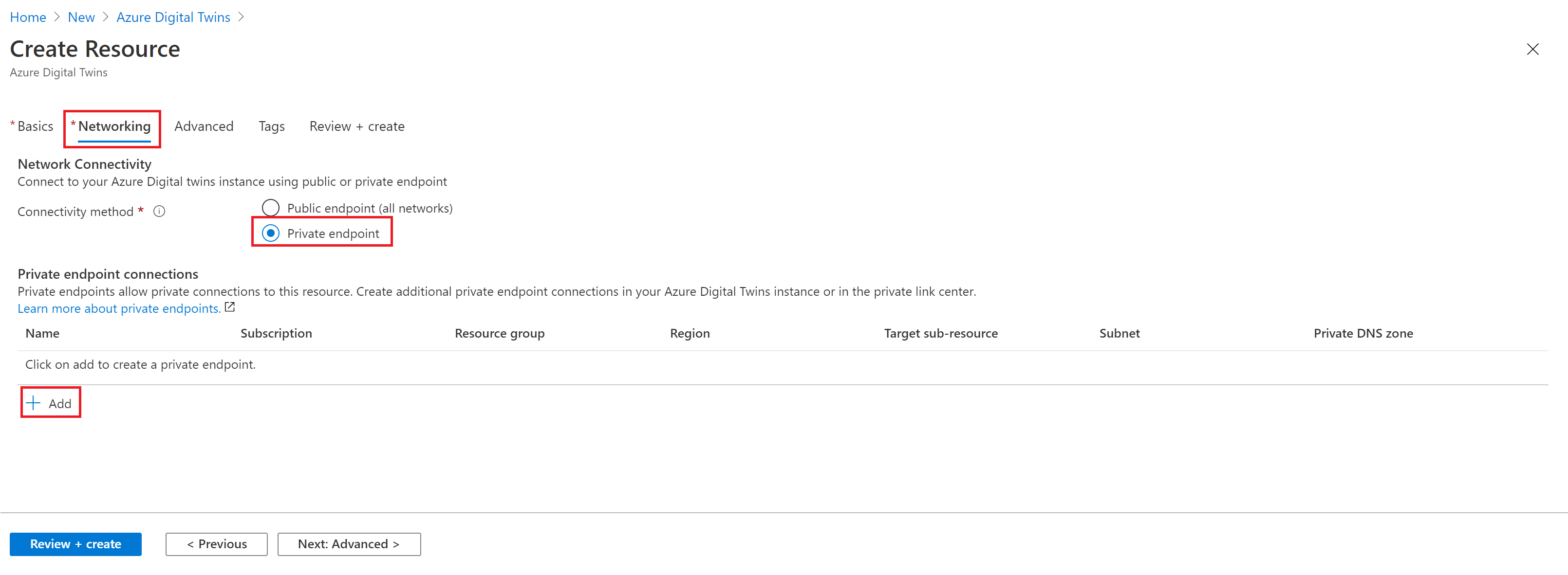 In this section, you create a private endpoint with Private Link as part of the initial setup of an Azure Digital Twins instance. This action can only be done in the Azure portal.