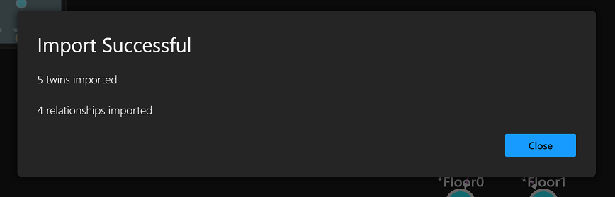 Azure Digital Twins Explorer uses the uploaded file to create the requested twins and relationships between them. Make sure you see the following dialog box indicating that the import was successful before moving on.
