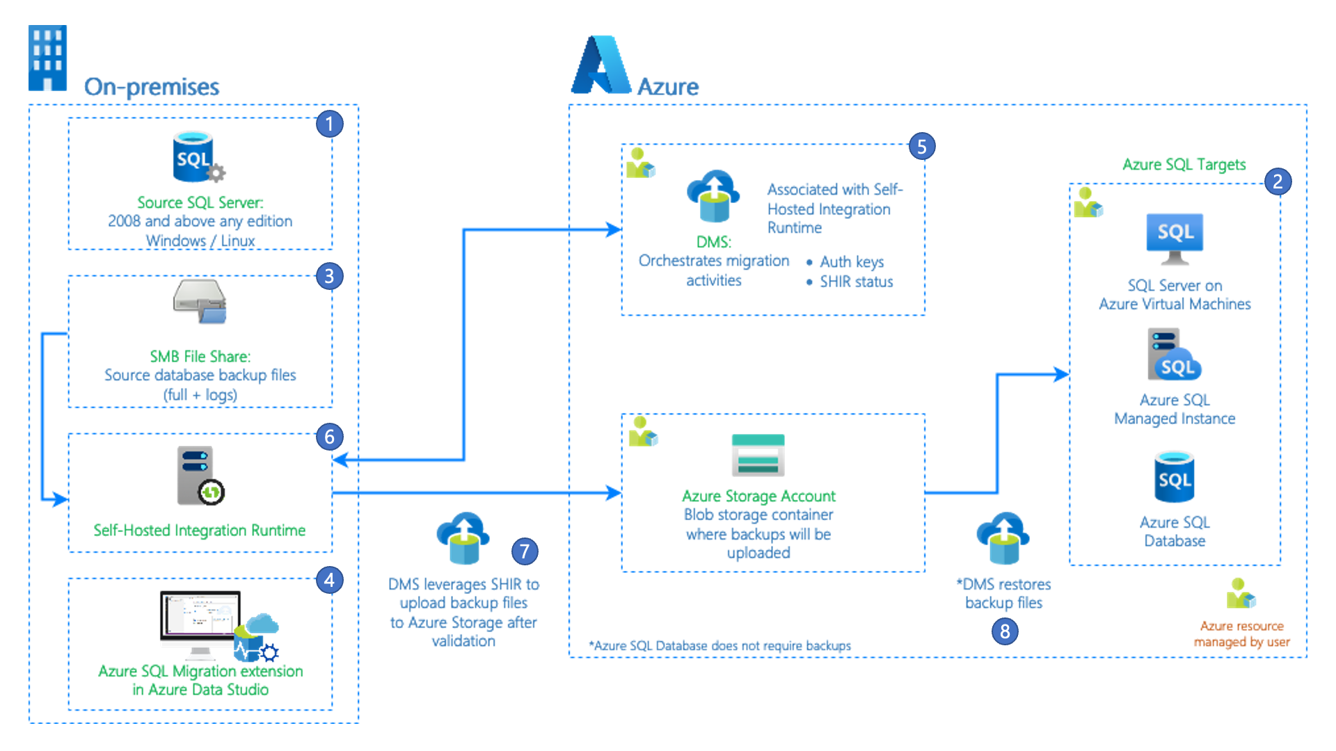 Database Migration Service uses the Azure Data Factory self-hosted integration runtime to access and upload valid backup files from your on-premises network share or from your Azure storage account.