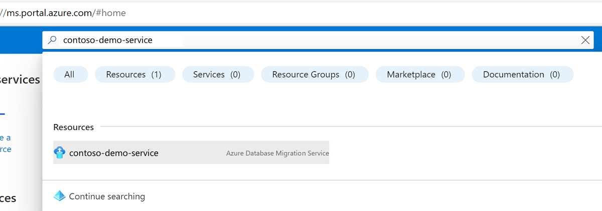 1. In the Azure portal, search for your instance of Database Migration Service by using the resource name.