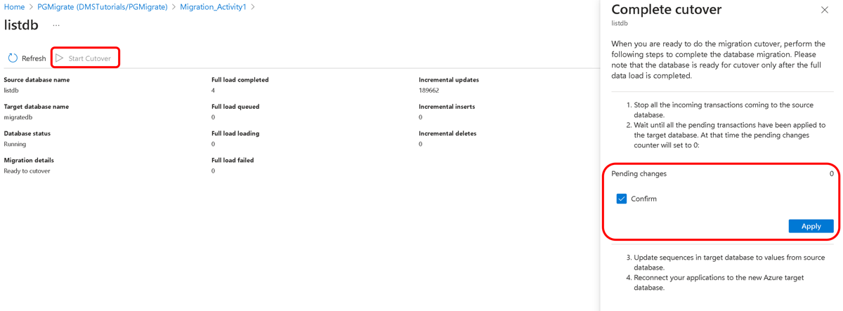 0to ensure that all incoming transactions to the source database are stopped, select the Confirm checkbox, and then select Apply.When the database migration status shows Completed, recreate sequences (if applicable), and connect your applications to the new target instance of Azure Database for PostgreSQL.