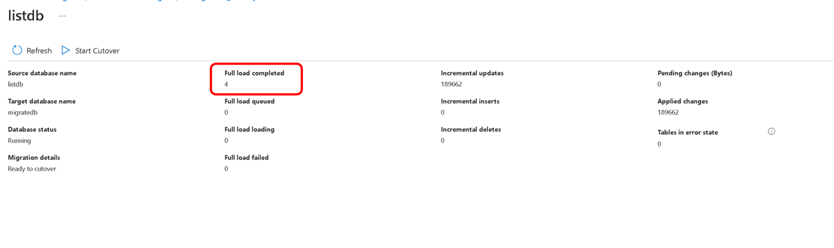 After the initial Full load is completed, the databases are marked Ready to cutover.