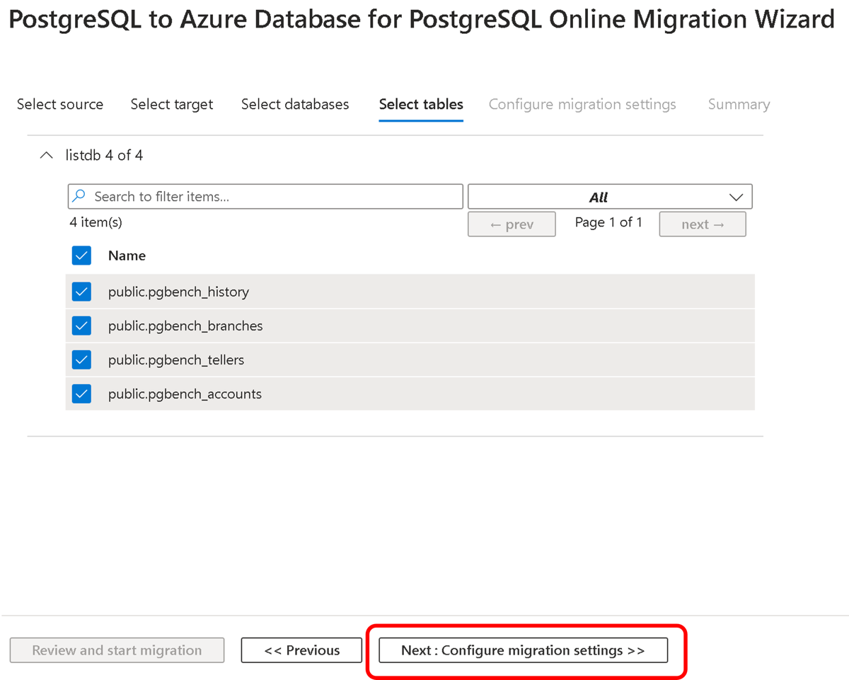 Select Next:Select tables, and then on the Select tables screen, select the required tables that need to be migrated.